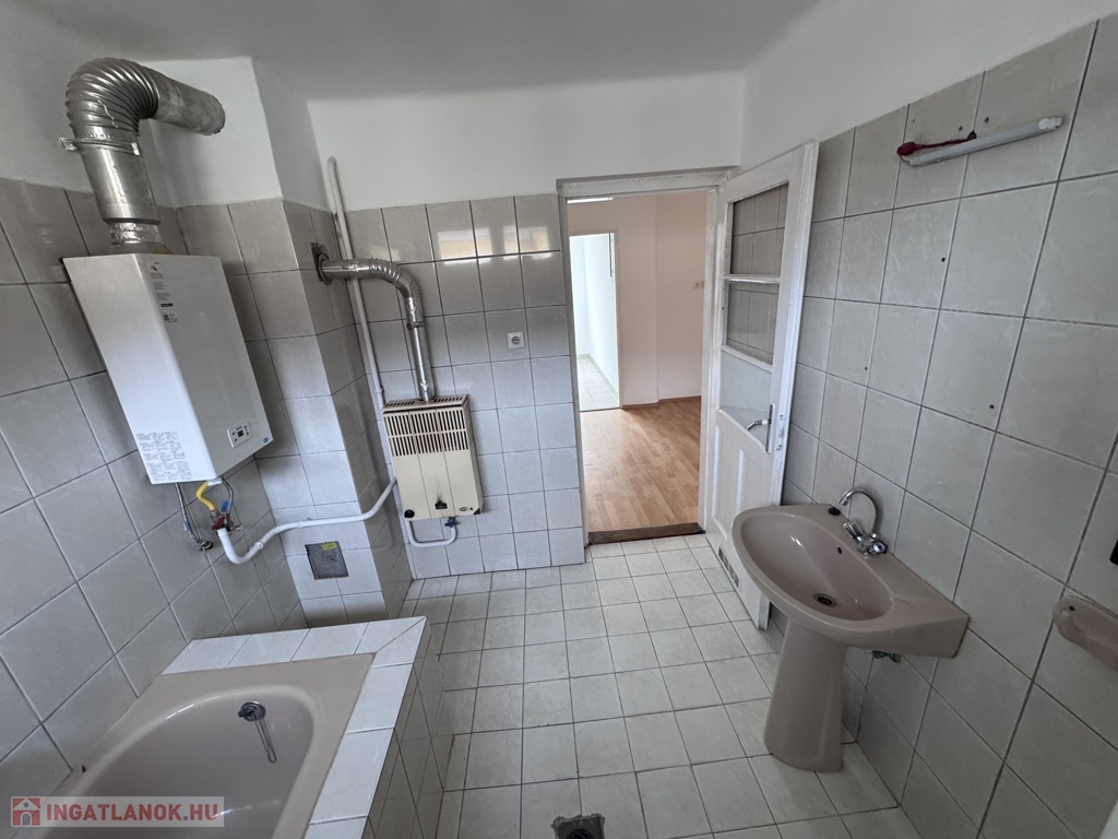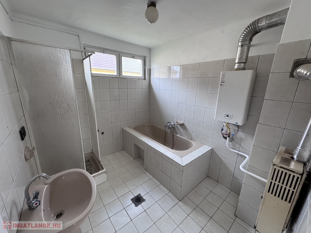 egyedi gázkonvektor + hangulatos cserépkályha, meleg víz gázbojlerből.