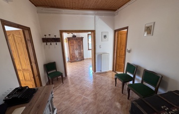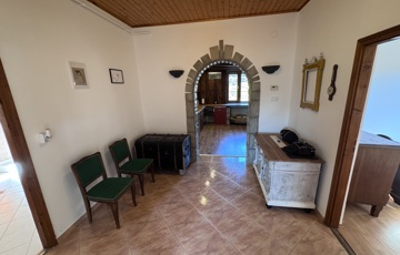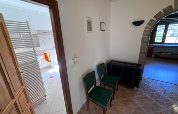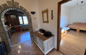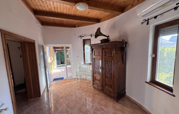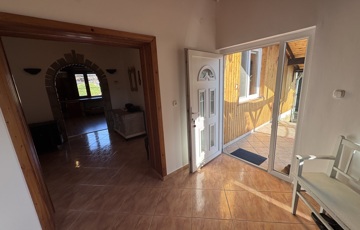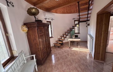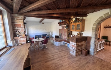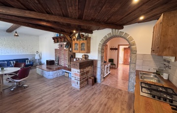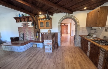 Az ingatlan egyik legszebb éke a nappali impozáns, fagerendás mennyezete, amely egyedi atmoszférát ad a térnek. A téglából épített konyhapult tovább erősíti a mediterrán hangulatot, amely végigkíséri a ház teljes arculatát.